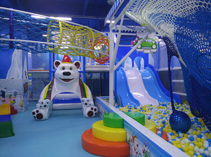 Even this indoor playground equipment on two level, but still put many interesting play events inside. the first one will be the net playground which hang one the ball pit, kids know can climbing up through the net playground, this design have one long net tunnel and many bridge. also with shooting area and trampoline area.